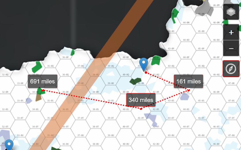 The hex map is scaled at 60 miles across each hex. Large squares are about 540 miles across when estimating travel.